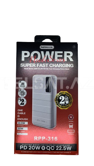 REMAX RPP-316, Noah seriyası ilə təqdim olunan 20000 mAh gücündə bir power bankdir və həm də USB Power Delivery (PD) və Quick Charge (QC) texnologiyalarını dəstəkləyir. Bu cihaz, mobil cihazlarınızı tez və effektiv şarj etmək üçün əla bir seçimdir.